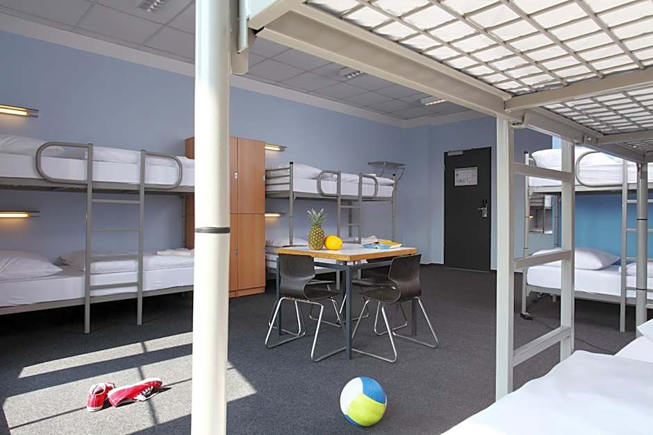 Large, simply furnished mixed dormitory. Shared bathroom facilities can be found in the hallway.